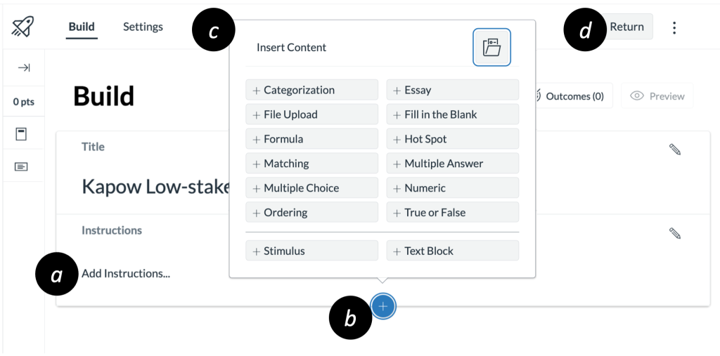- Click the blue plus sign [b] and select the type of question from the “Insert Content” pop-up [c].