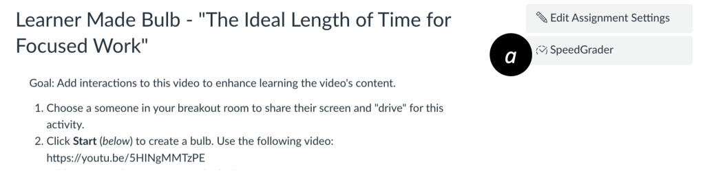 - Open an Assignment that has student submissions. On the right sidebar, click SpeedGrader [a] to start grading