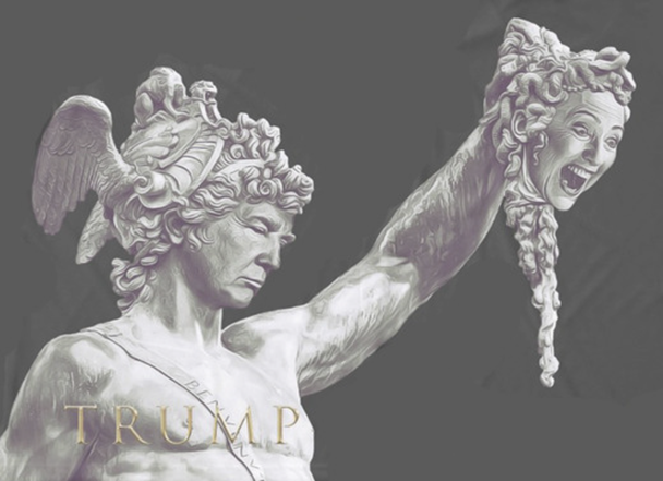 - Hillary Clinton portrayed as Medusa, with Trump as Perseus.